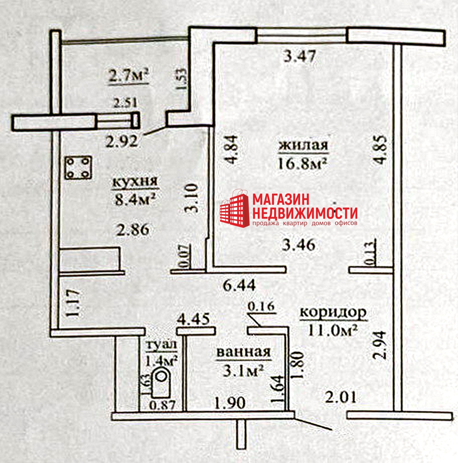 Общая площадь по СНБ- 43,4 кв.м. Общая площадь квартиры- 40,7 кв.м., жилая комната- 16,8 кв.м., кухня- 8,4 кв.м..