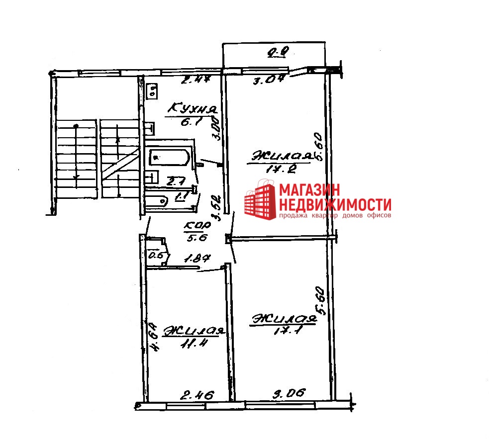 Общая площадь по СНБ — 61,1 кв.м., жилая площадь — 45,7 кв.м., кухня — 6,1 кв.м.