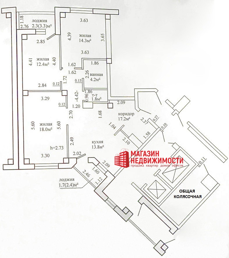 Общая площадь по СНБ- 85,7 кв.м. Общая площадь жилого помещения- 81,7 кв.м. Жилая площадь квартиры- 44,7 кв.м. в которую входят три комнаты площадью: 18,0; 14,3; 12,4 кв.м., кухня- 13,8 кв.м., ванная- 4,2 кв.м., туалет- 1,8 кв.м., две лоджии- 3,3; 2,4 кв.м., коридор- 17,2 кв.м. На площадке имеется общая кладовая для хранения детских колясок и велосипедов.