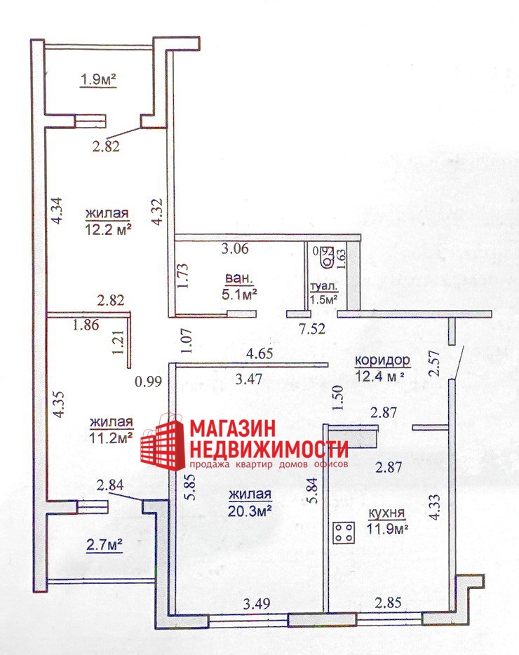 Общая площадь квартиры по СНБ- 79,2 кв.м.. Жилые комнаты- 20,3; 12,2; 11,2 кв.м., кухня- 11,9 кв.м., ванная- 5,1 кв.м., туалет- 1,5 кв.м., две лоджии- 1,9; 2,7 кв.м., коридор- 12,4 кв.м.