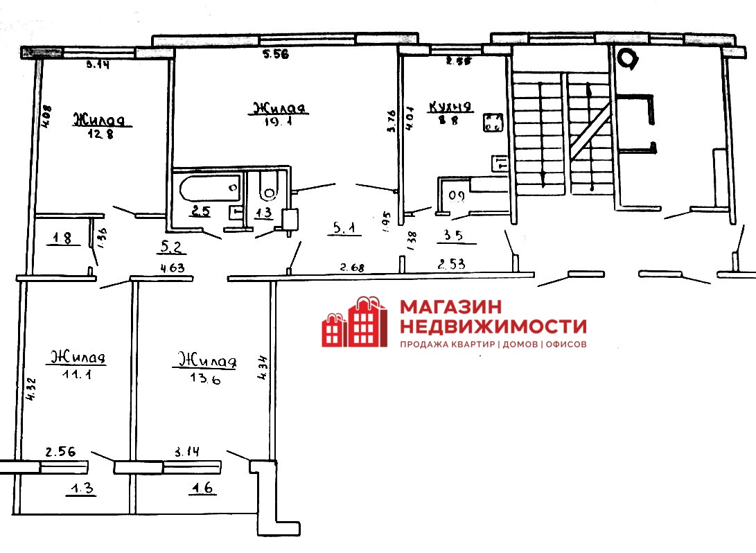Общая площадь квартиры- 88,6 кв.м., жилые комнаты: 19,1 кв.м., 13,6 кв.м., 12,8 кв.м., 11,1 кв.м.,кухня- 8,8 кв.м.