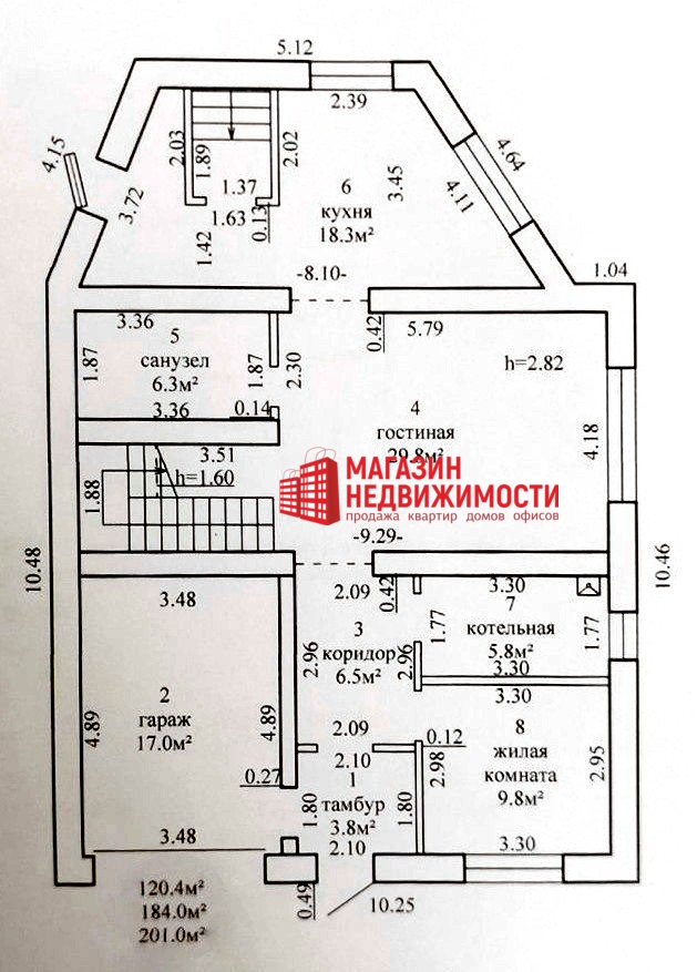 На первом этаже находятся: кухня- 18,3 кв.м, гостиная- 29,8 кв.м., жилая комната- 9,8 кв.м., санузел- 6,3 кв.м., котельная- 5,8 кв.м., гараж- 17,0 кв.м., коридор- 6,5 кв.м., тамбур- 3,8 кв.м. Высота потолков- 2,82 м.
