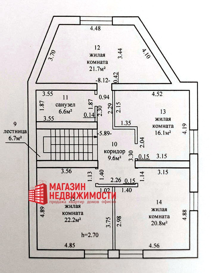 Мансардный этаж: четыре жилых комнат- 22,2; 21,7; 20,8; 16,1 кв.м., санузел- 6,6 кв.м., коридор- 9,6 кв.м., лестница- 6,7 кв.м. Высота потолков- 2,70 м.