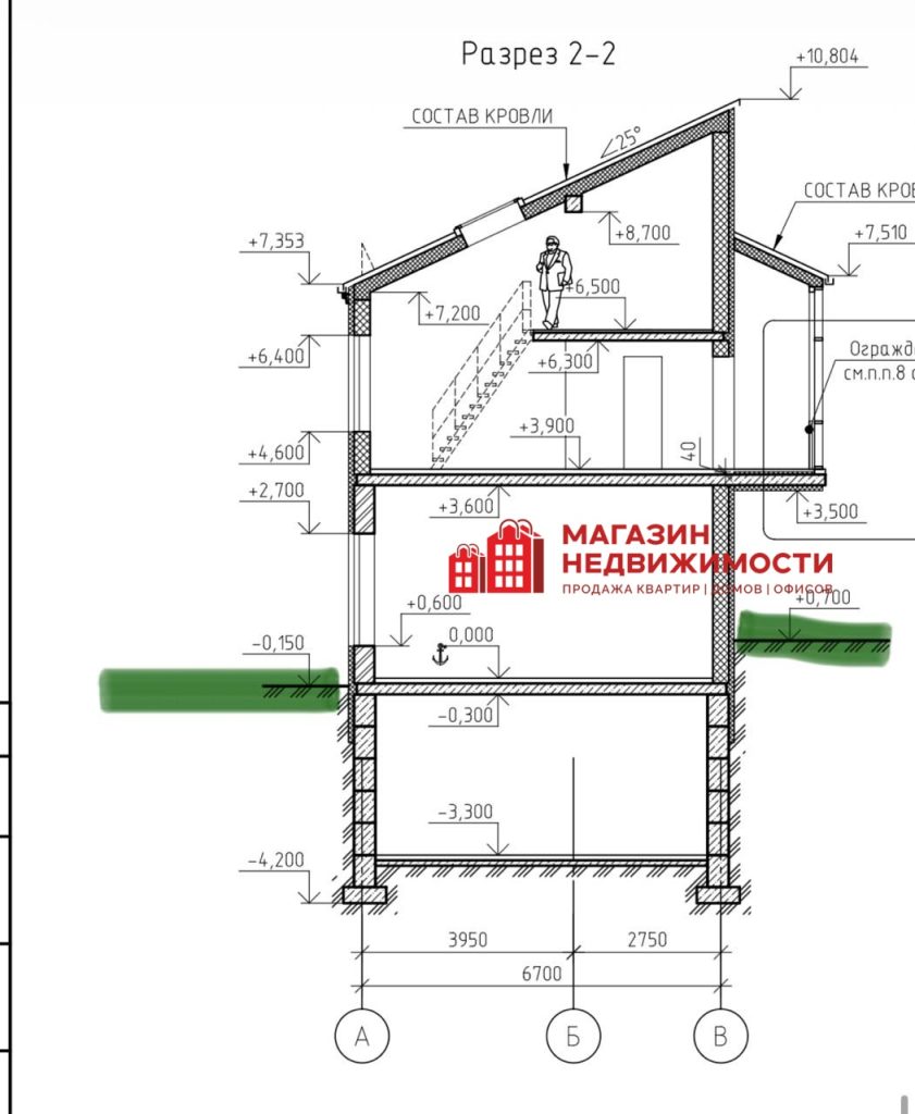 Высота потолков: подвал 3,0 м; первый этаж 3,6 м; мансарда 4,8 м.