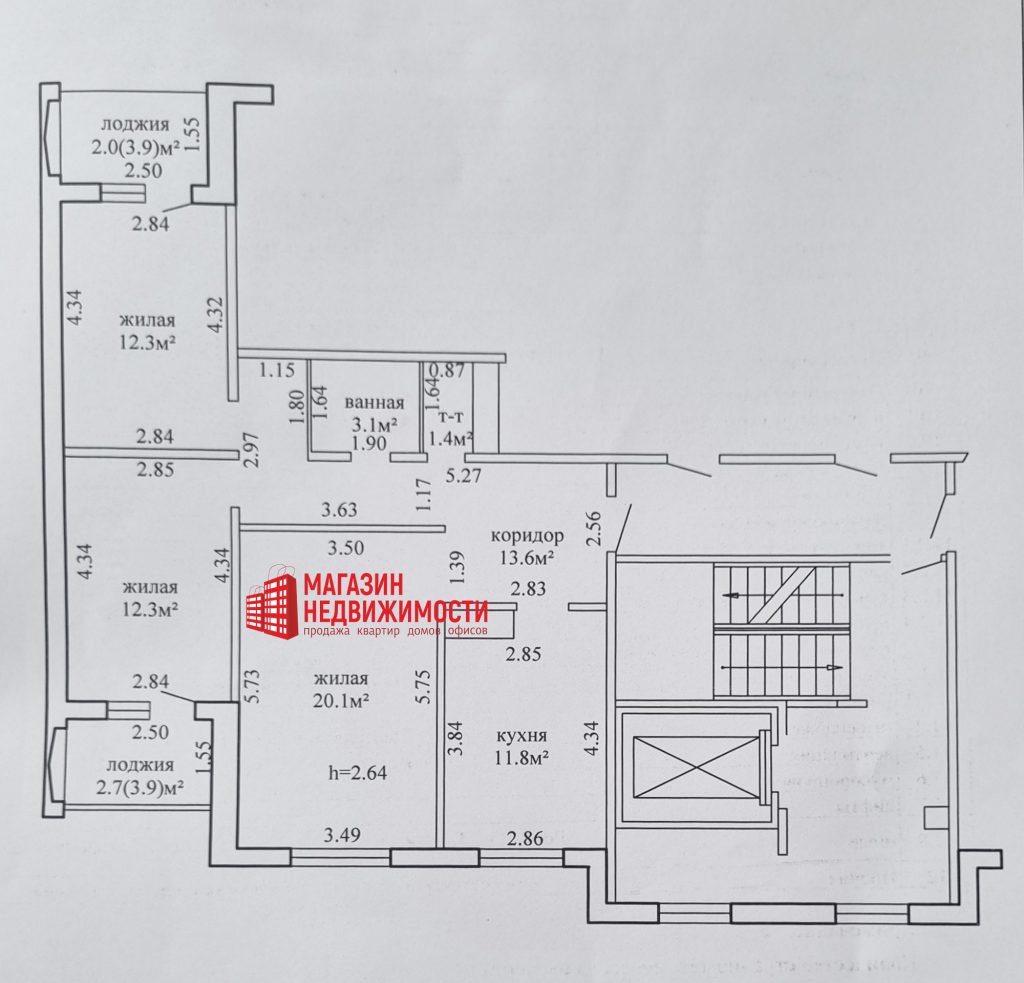Характеристики квартиры: площадь по СНБ – 79,3 кв.м, общая –74,6 кв.м, жилая – 44,7 кв.м, кухня – 11,8 кв.м. Две застекленные лоджии – по 3,9 кв.м. Высота потолка 2,64 м. Раздельный санузел.