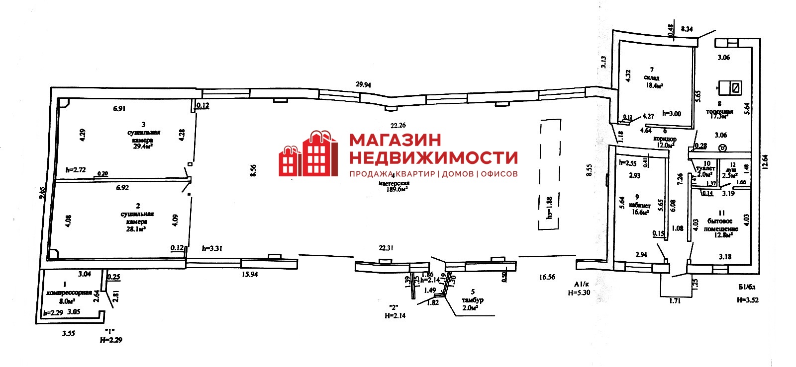 Здания включают в себя: мастерские, офис, подсобные помещения (комната для персонала, склад, санузел, душевые, топочная).