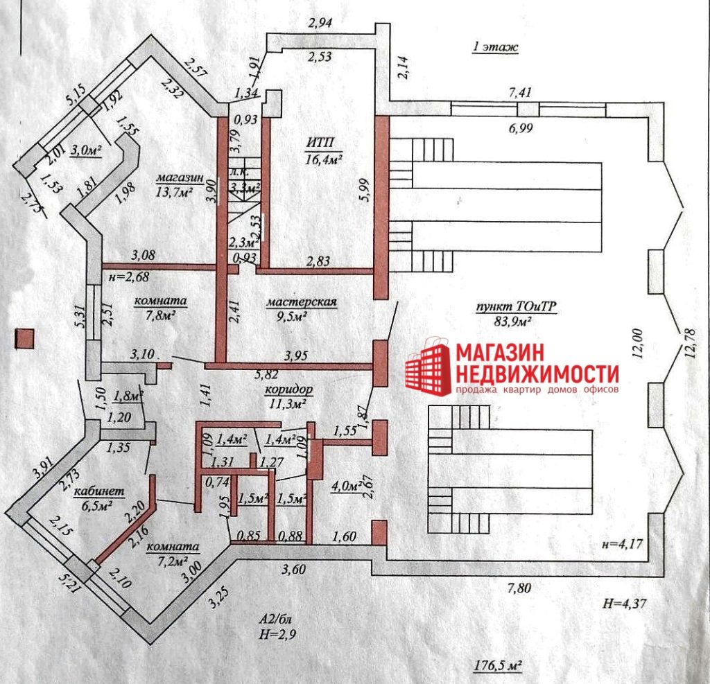 Высота потолков: Пункт ТО 4,17м. (есть две смотровых ямы), магазин/кабинеты- 2,9 м., мансардный этаж- 2,30 м., 3,25 м.. Материал стен и перегородок- газосиликатный блок, кирпич. Фундамент- бетон. Перекрытия междуэтажные- железобетонные плиты. Чердачные перекрытия- деревянные. Крыша- металлочерепица. Окна стеклопакеты ПВХ. Год постройки 2008.