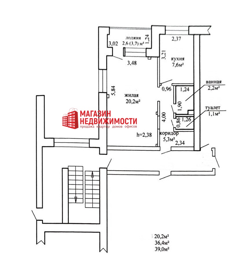 Общая площадь — 39.0 м2, жилая — 20.2 м2.